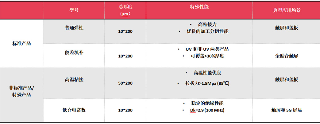 應(yīng)用闡述:LCD觸屏顯示模組中G+G, G+F, G+FF等材料的粘接,LCD顯示器面板各類光學(xué)膜片的背膠粘接